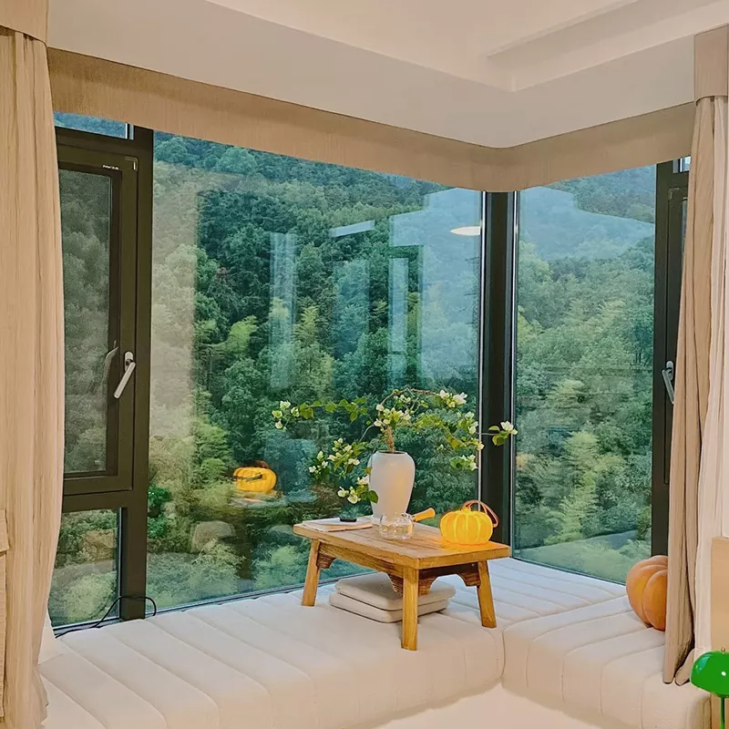 Zasnova ima strukturo "okvir iz anodizirane aluminijeve zlitine + kaljeno steklo" z integriranim kotnim sklopom za enakomerno porazdeli obremenitev in zagotovi stabilnost, hkrati pa ohrani lahek okvir. Okna so opremljena z zunanji ali skriti tečaji iz aluminijeve zlitine, ki se odpirajo pod kotom 90° in tesno tesnijo, ko so zaprti. Drsenje okna imajo tih sistem vodil, ki gladko drsi, zmanjšuje hrup in prihrani prostor – idealno za majhne stanovanja.