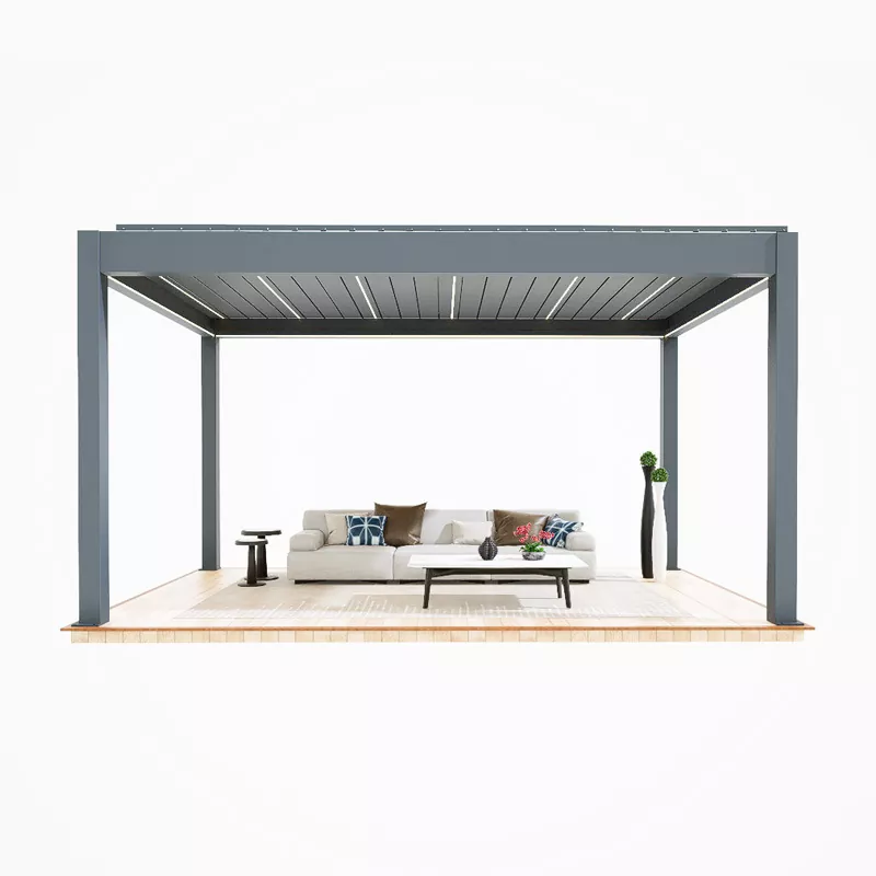 Glavna prednost inteligentnega nadzornega paviljona je "minimalistična estetika + inteligentno jedro". Temelji na oblikovanju poenostavljenih linij in nevidno integrira module, kot so inteligentni senčnik, osvetlitev in indukcija vetra in dežja, pri čemer ohranja pregleden in čeden minimalističen videz, hkrati pa dosega avtomatski nadzor celotnega scenarija. Glavno ohišje je izdelano iz lahkih profilov iz aluminijeve zlitine z mat fluoroogljično prevleko, uravnoteženo odpornostjo na vremenske vplive, odpornostjo proti koroziji in teksturo. Inteligentne komponente imajo vodoodporno zasnovo IP65 in se prilagajajo zapletenim zunanjim okoljem. Lahko ga upravljate na daljavo prek aplikacije APP in ga upravljate z glasovnimi ukazi, pri čemer izvaja funkcije, kot so samodejno odpiranje in zapiranje senčnika, postopno spreminjanje osvetlitve in samodejno zapiranje kot odziv na veter in dež, kar uravnovesi udobje in tehnološki smisel.