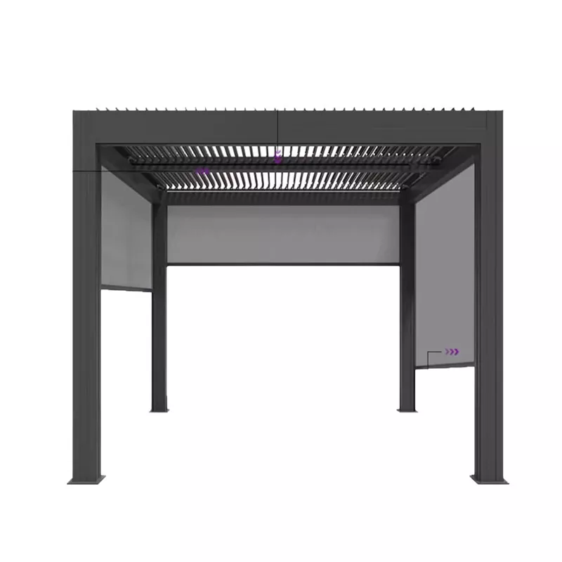 Dvorišni inteligentni paviljon (3000 × 3000 mm): stebri 60 × 60 mm, streha iz kaljenega stekla + inteligentni senčnik, primeren za zasebna dvorišča;